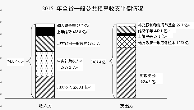 收支平衡情况:2015年,全省地方收入2513.1亿元,加上中央补助2927.3亿元,地方政府一般债券收入1395亿元,上年结转478.8亿元,调入资金76.3亿元,调入预算稳定调节基金16.9亿元,可安排使用的收入总量为7407.4亿元。全省财政支出5684.5亿元,加上地方政府一般债务还本1222亿元,上解中央29.1亿元,补充预算稳定调节基金29.7亿元(包括当年超收收入和按照中央规定清理收回的结余结转资金,下同),结转下年442.1亿元,支出总计7407.4亿元,当年收支平衡。
