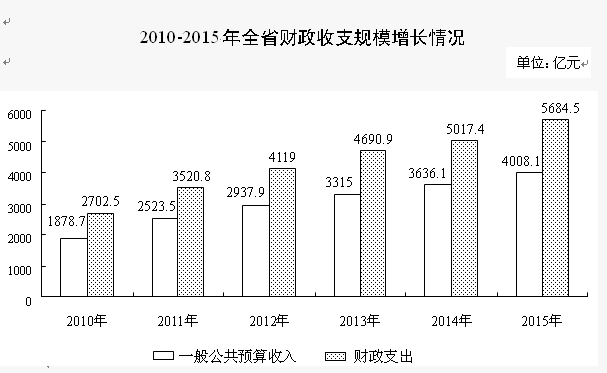收入预算执行情况:全省一般公共预算收入跨上了新台阶,完成4008.1亿元,增长10.2%。其中,地方收入2513.1亿元,增长11.1%;上划中央收入1495亿元,增长8.9%。2015年以来,面对经济下行压力加大的严峻挑战,省委省政府科学研判,及时果断地采取了一系列定向定量的调控措施,为稳定经济运行、增强经济活力发挥了显著作用。主要是积极推进简政放权,充分发挥结构性减税清费等财政政策工具的逆周期调节作用,全年营改增、小微企业和个体工商户暂免征收营业税和增值税等共计减税60亿元,免征28项小微企业收费,坚决禁止征收“过头税”,切实减轻企业税费负担和制度性交易成本。实行财政与金融协同联动,建立覆盖所有县市的政府性中小微企业融资担保体系,探索政府、银行、担保机构或保险机构共同参与、共担风险的合作机制,有针对性地缓解中小微企业和“三农”融资难题。扩大基础设施投资,降低市场准入门槛,运用财政增信效应和杠杆功能,创新投融资机制,撬动民间资本、利用市场机制构筑交通、水利、能源和信息四张网。调整和完善产业政策,加快淘汰落后产能,下大力气培育新的增长点,重点实施创新创业园区“135”工程,培育移动互联网、轨道交通装备、环保、现代服务业等新兴产业,推进第三轮特色县域经济发展工程,结合“百企千社万户”和“百片千园万名”兴农工程,支持农业产业化规模化经营。财政收入年初小幅低开后,从2月份起就扭负为正并稳定上升,下半年一直在10%以上。这是在经济增长放缓的背景下,调结构转方式过程中实现的增长,结果来之不易。