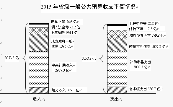 省级地方收入389.1亿元,加上中央补助2927.3亿元,地方政府一般债券1395亿元,上年结转194.1亿元,市县上解54.6亿元,调入预算稳定调节基金16.9亿元,调入政府性基金和国有资本经营预算资金76.3亿元,可安排使用的收入总量为5053.3亿元。省本级支出530.7亿元,加上补助市县3007.5亿元,转贷市县债券1059.2亿元,债券还本279.8亿元,上解中央29.1亿元,补充预算稳定调节基金29.7亿元,结转下年117.3亿元,支出总计5053.3亿元,当年收支平衡。2015年末,省级预算稳定调节基金余额69.6亿元。