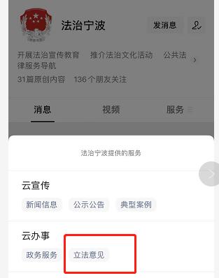 二、关注“法治宁波”微信公众号,点击菜单栏【云办事】——【立法意见】,即可登录宁波市司法局立法意见征集系统,再点击“地方性法规案”提出意见建议。