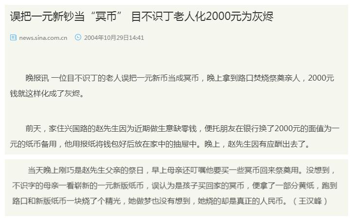 在过去,烧的基本上都是黄纸,但是,近年来不少商家为了片面追求时尚的需求,在售卖的祭祀用品中存在仿制不同面额、款式的人民币样式冥币的情况,这些冥币的币纸大小、颜色、图案、面值等都与现行流通或曾经流通的人民币极为相似,不同的往往是上面的字样。销售仿人民币图样冥币的行为不仅违反了《中国人民银行法》和《人民币管理条例》,而且在冥币上使用已故伟人、国家领导人的头像,严重损害伟人形象,侵害了社会公序良俗,甚至发生乡下老人误把价值巨大人民币当做冥币焚烧的恶果。