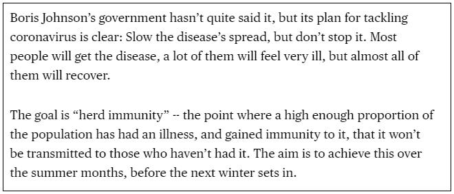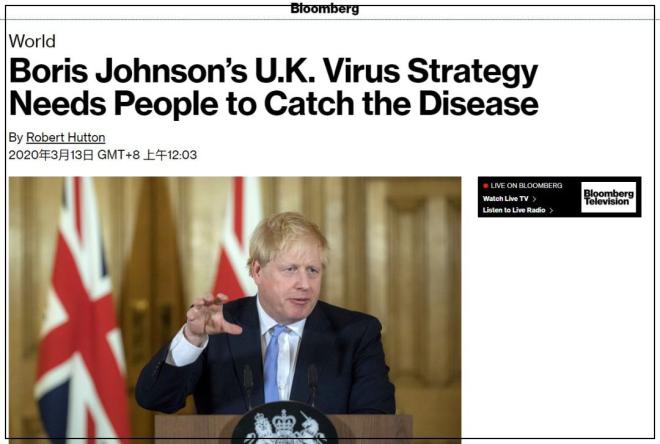 在一篇名为“鲍里斯·约翰逊的英国病毒防疫策略,是让人们都去感染病毒”的报道中,彭博社表示:虽然约翰逊的政府没有明着说出“让所有人都去得病”这句话,但他们策略中的这个意图已经很明显了,即要放缓病毒的传播,但并不是去完全控制这个病毒,让人们在今年夏季慢慢地去感染,然后逐渐康复,进而在冬天之前达到“人群免疫”的目标。