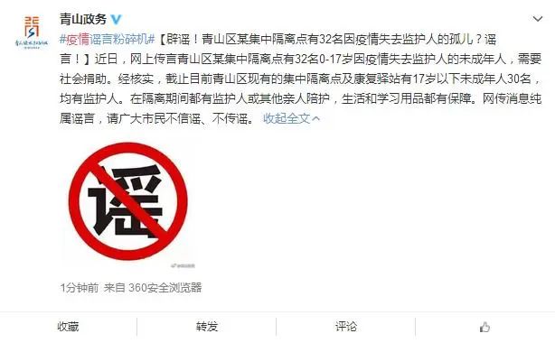 谣言:近日,网上传言青山区某集中隔离点有32名0-17岁因疫情失去监护人的未成年人,需要社会捐助。
