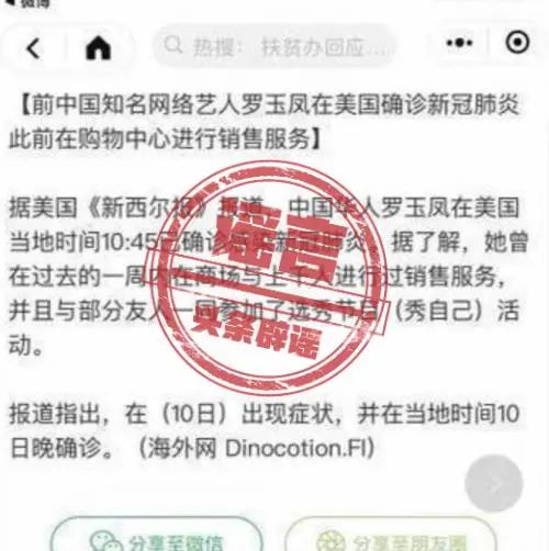 谣言:3月12日,一篇名为《前中国知名网络艺人罗玉凤在美国确诊新冠肺炎,此前在购物中心进行销售服务》的文章在网络上流传。文章指出,罗玉凤在美国当地时间10日晚10:45分确诊感染新冠肺炎,并称其在确诊前与商场内上千人有过接触。