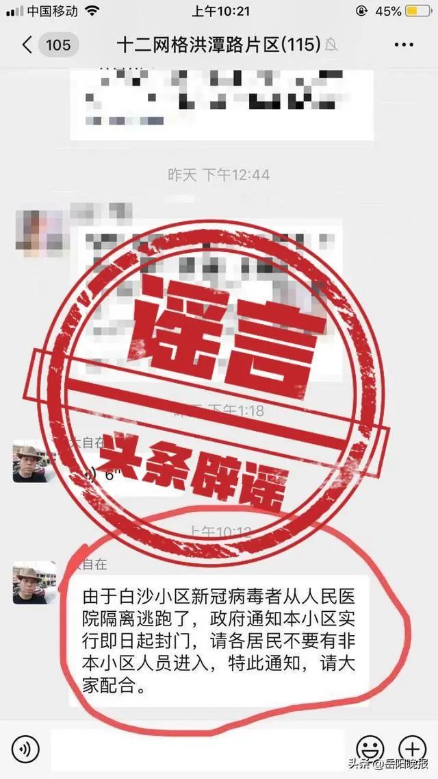 谣言:近日,有消息称“由于岳阳白沙社区新冠病毒者从人民医院隔离逃跑了。政府通知本小区实行即日起封门......”