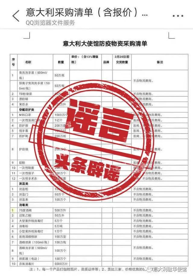 谣言:近日,网上流传一份关于“意大利驻华大使馆正在为意大利采购防疫物资”的采购清单,有消息称:意大利驻华大使馆正在通过社交媒体采购相关防疫物资。