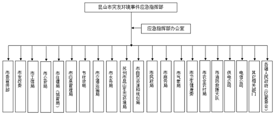 《昆山市突发环境事件应急预案》规定,昆山市人民政府下设市突发环境事件应急指挥部,统一领导全市突发环境事件的应急处置工作。昆山市重点湖泊突发蓝藻水华事件与突发环境事件共用一套应急指挥体系,市突发环境事件应急指挥部同时作为重点湖泊突发蓝藻水华事件的应急指挥机构,由指挥机构、办事机构、地方机构、现场工作机构、专家组等组成。