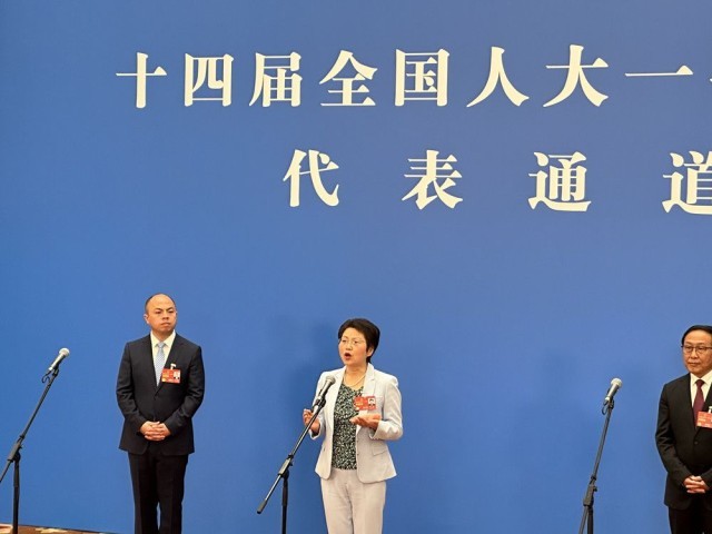 全国人大代表、成都大熊猫繁育研究基地副主任侯蓉在代表通道上,手捧一个大熊猫新生幼崽的仿真模型,动情讲述她与大熊猫的不解之缘。 贺瑶/摄