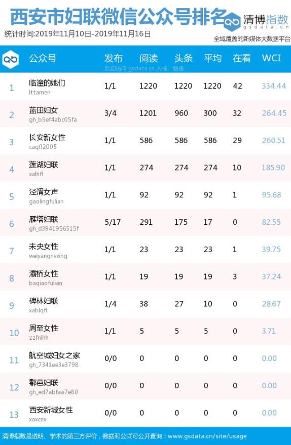 西安市区县妇联微信公众号传播指数排行榜