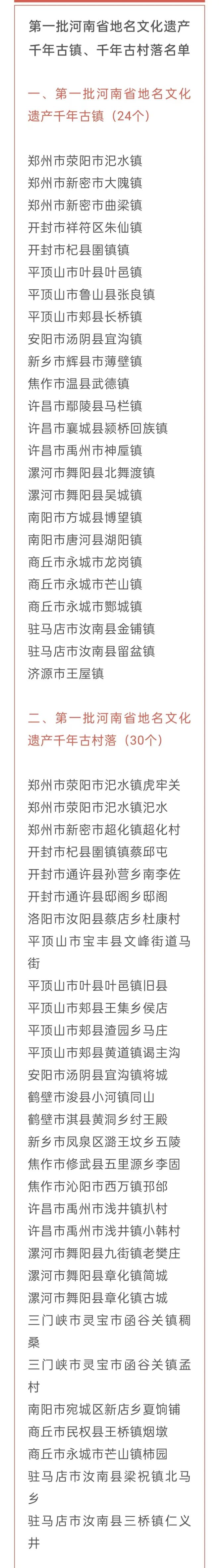 为大力弘扬中华优秀传统文化,切实保护、挖掘和传承地名文化遗产,反映和宣传中国传统政治、经济、文化、历史、民俗发展史,增强文化自信,省民政厅组织开展了“河南省地名文化遗产千年古镇、千年古村落”认定工作。经各地遴选推荐、史料考证、实地考察、专家评审等程序,认定此次公布的千年古镇、千年古村落名单。