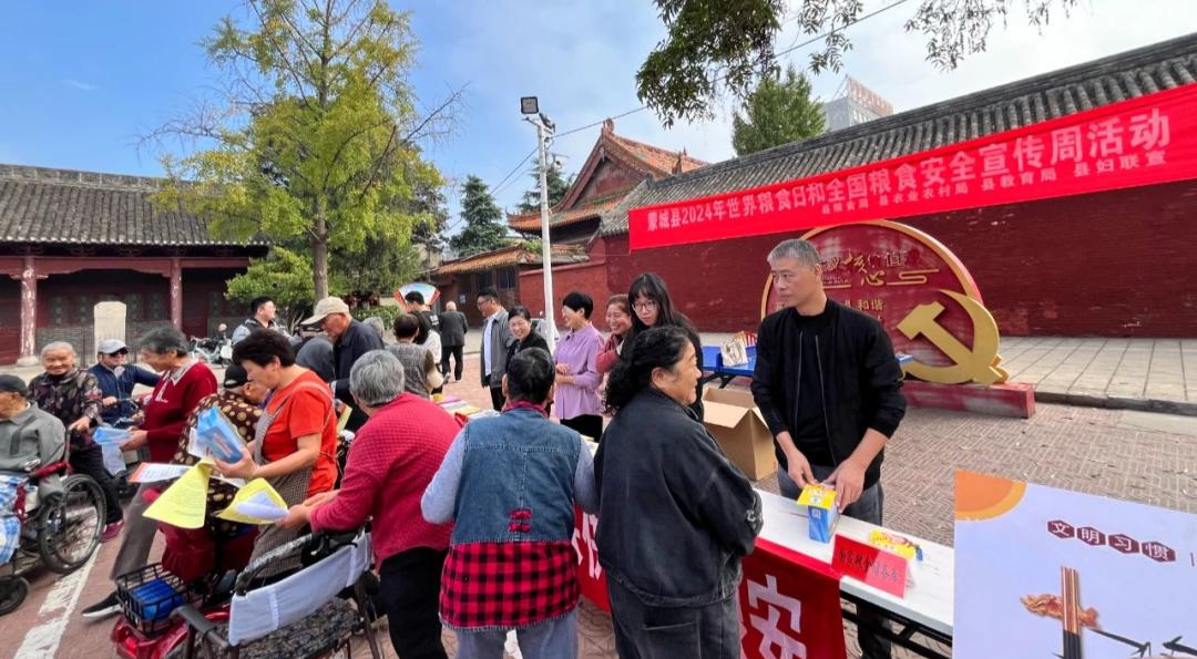 为深入贯彻习近平总书记关于大食物观的重要论述精神,充分发挥广大妇女在“种粮兴粮、爱粮节粮”中的积极作用,进一步增强妇女群众爱粮节粮意识,促进粮食可持续发展,10月16日,县妇联、县粮食局、县农业农村局、县教育局等单位联合在圣人殿广场举办以“强法治 保供给 护粮安”为主题的蒙城县“世界粮食日”和“粮食安全宣传周”活动。