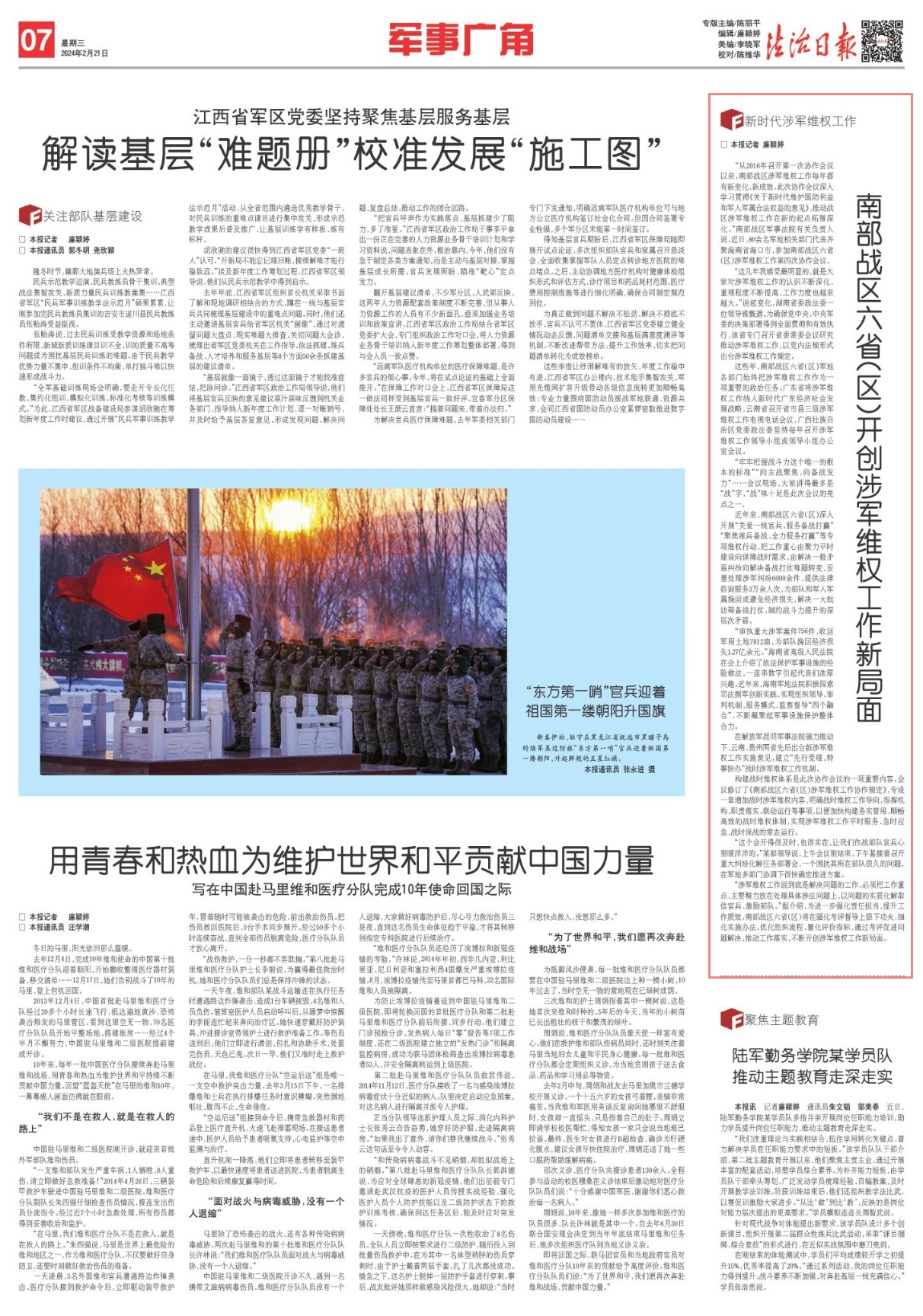 近年来,南部战区六省(区)深入开展“关爱一线官兵、服务备战打赢”“聚焦练兵备战、全力服务打赢”等专项维权行动,把工作重心由聚力平时建设向保障战时需求、由解决一般矛盾纠纷向解决备战打仗难题转变,妥善处理涉军纠纷6000余件,提供法律咨询服务3万余人次,为部队和军人军属挽回或避免经济损失,解决一大批妨碍备战打仗、制约战斗力提升的深层次矛盾。