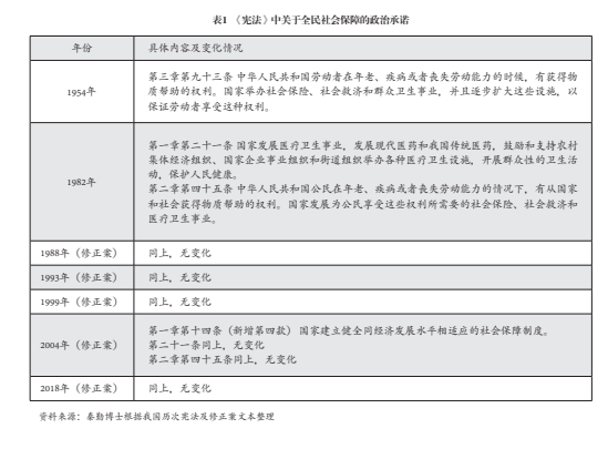 在此后的《宪法》修正案中,社会保障宪法理念与原则被坚持和不断完善(见表1),由此形成一种坚不可摧的政治承诺。