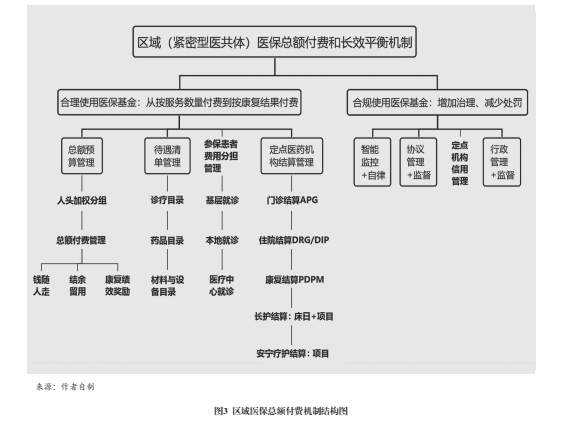 第三,医保基金使用与监督关系。医疗保障基金是源自参保人缴费和财政补贴的准公共品,需要依法建立合理使用与合规使用的治理机制(见图3)。一是依法建立医保基金合理使用机制,包括区域(紧密型医共体)总额预算管理、待遇目录管理、参保患者分担政策、定点医药机构结算与奖惩机制四个环节。区域总额付费是以居民为中心进行资源配置的制度安排,在以收定支的模式下,发挥我国全民医保和地方统筹的闭环管理体制优势,打造长效平衡机制。目前,我国在住院按病组分值(DRG/DIP)付费方面有所突破,门诊病组分值(APG)和康复病组+患者状况的组合分值(PDPM)等尚未完成,区域总额付费机制尚未定型。二是合法使用医保基金的监督机制,做到依法办事、违法必究;增加治理、减少处罚。医疗保障基金使用的个性化和信息不对称决定其属于道德风险高发领域,需要建立健全智能监控与自律、协议履行与监督、行政检查与监督三个环节。