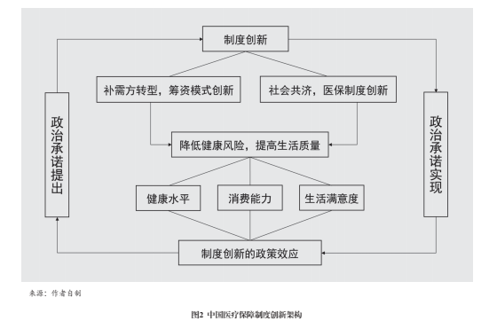 居民社会保险的制度创新。中国居民医疗保障制度创新架构由如下三个部分构成(见图2):一是“以降低健康风险和提高生活质量”为基点的执政理念,形成中国全民医疗保障的政治承诺;二是优化资源配置的公共选择和制度创新,包括加大财政补贴力度,以3:1的激励机制,引导居民参加社会医疗保险;建立“分两步走”的策略和运行机制;确保兑现实现全民医疗保障的政治承诺;三是评价制度创新的社会效应。有研究用双重差分(DID)模型,[4]即二元固定效应模型,合理量化政策这一外生因素,分别对试验前后和试点区域内外的效应进行固定,从健康水平、消费能力和生活满意度三个方面对中国居民医疗保险制度创新的政策效应进行评价,并按照户口、年龄、收入水平、地理区位、城镇化水平、统筹层级等分组进行了异质性分析。研究结果显示,医疗保险覆盖范围的扩大和保障水平的提高对居民的健康水平、消费能力和生活满意度均有显著提升效应,城乡居民医疗保险整合政策对农村户口、中老年群体、低收入人群以及西部、城镇化率较低地区的居民生活满意度提升效应更为明显,实现省级统筹的省份提升效应优于其他地区。