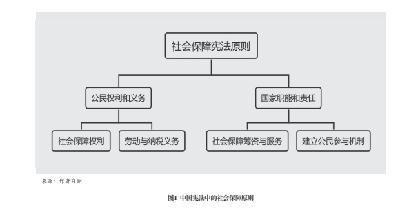 1954年《中华人民共和国宪法》提出“建立社会主义社会”的目标,第93条规定:“国家举办社会保险、社会救助和群众卫生事业,并且逐步扩大这些设施,以保证劳动者享受这种权利。”第102条规定:“中华人民共和国公民有依照法律纳税的义务。”1982年《中华人民共和国宪法》第42条规定:“中华人民共和国公民有劳动的权利和义务。”由此形成的社会保障宪法理念是“取之于民、用之于民”,社会保障是公民权利,也是公民义务;社会保障宪法原则是国家承担动员和组织公民共建共享社会保障制度与服务的责任(见图1)。由此可见,社会保障属于社会法范畴,有别于公法(以行政法为主)和私法(以民法为主),具有非公非私、亦公亦私的特征。在法制建设相对成熟的欧洲国家,社会保障法有“小宪法”之称。德国将社会保障法律编入社会法体系,即社会法编纂。