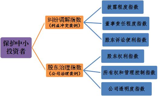 “保护中小投资者”是世界银行全球营商环境评估的十二大指标之一,下设两个二级指标,即“纠纷调解指数”与“股东治理指数”。其中,“纠纷调解指数”衡量在利益冲突的情况下中小持股者受到的保护,包括关联交易的透明度(披露程度指数)、股东对关联交易提起诉讼及问责(董事责任程度指数)以及股东在诉讼里获取证据和股东诉讼中的法律费用分担(股东诉讼便利度指数)三个三级指标;“股东治理指数”衡量在公司治理结构中股份持有人的权利,包括制定公司重大决策时股东的权利(股东权利指数),用于防止不适当的董事会结构和自我固化的保障措施(所有权和管理控制指数)和对公司所有权、薪酬、审计和财务的透明度(公司透明指数)三个三级指标。