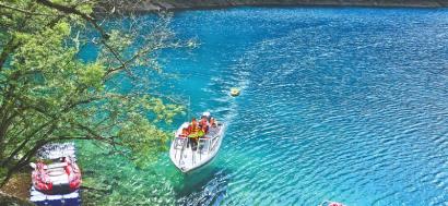 科研团队成员乘巡逻船在九寨沟长海开展测量工作。