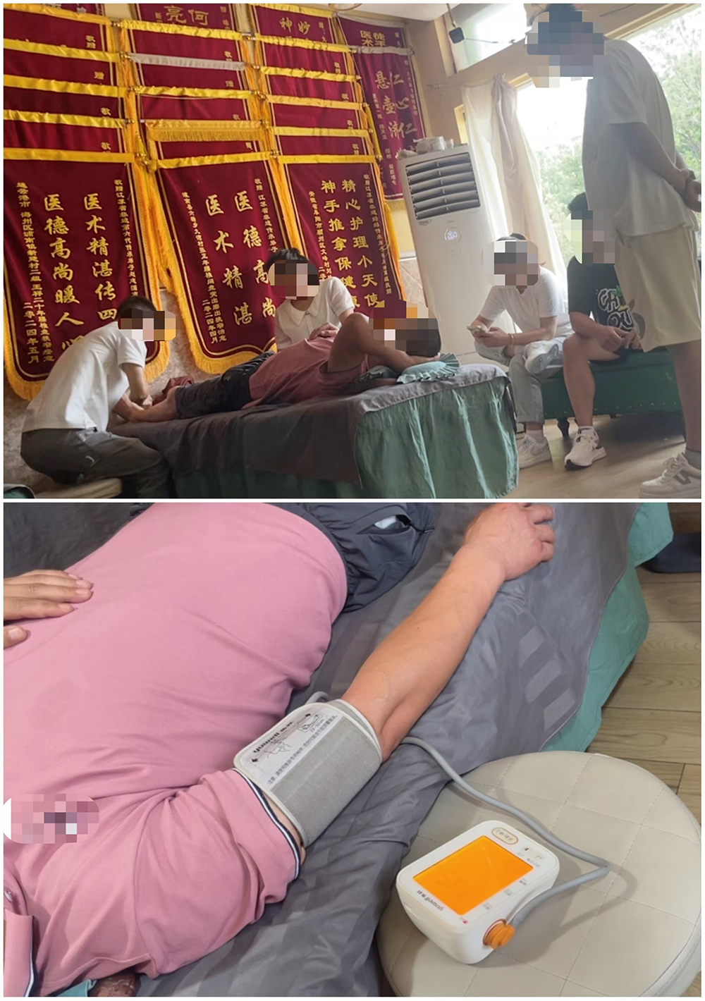 “能,怎么不能,马上降。”喻兴兵让弟子取来了血压仪帮他测量,并召来在角落玩手机的小丁和另一名男弟子,让他们站在床对侧,给他按压内关穴、三阴交、足三里等多处穴位,每处持续3分钟。还让其他围看的弟子拍摄视频。