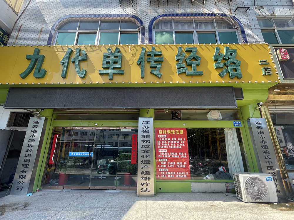 喻兴兵的“九代单传经络店”位于灌南县人民中路一侧,门口三块银色牌匾写着“江苏省非物质文化遗产经络疗法”“连云港市非遗喻氏中医经络疗法”“连云港市喻氏经络调理有限公司”。