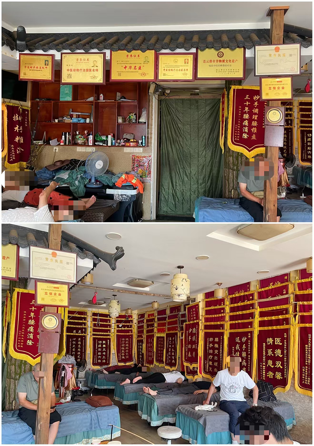 8月中旬,天气炎热。推门进店,烟味混着汗臭味,扑面而来。店里面积不大,墙上层层叠挂着“患者”送来的锦旗,十余张按摩床靠墙摆放,随处散落、堆放着杂物。正对大门的吊顶处还挂有“中医经络疗法国医名师”“中华名医”等多块荣誉牌匾。