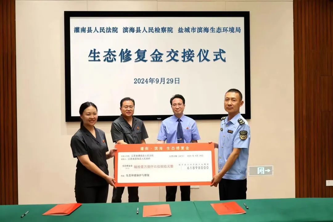 仪式上,灌南县人民法院向滨海县人民政府现场移交生态修复金60万余元。该笔资金主要来源为由滨海县人民检察院起诉的环资刑事案件或刑事附带民事公益诉讼案件中用于生态环境修复或赔偿的资金。该项资金将用于滨海生态环境保护与修复。备忘录的签署,标志着滨海县域内生物多样性一体化保护机制的建立,在生态环境保护、生态环境替代性修复、环境资源司法教育宣传等方面,形成法、检、政府职能部门协同共治的环境保护新格局,开启灌河流域内生态环境系统防治和整体保护新篇章。