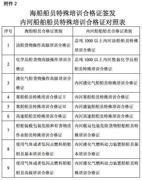 2.海船船员特殊培训合格证签发内河船舶船员特殊培训合格证对照表