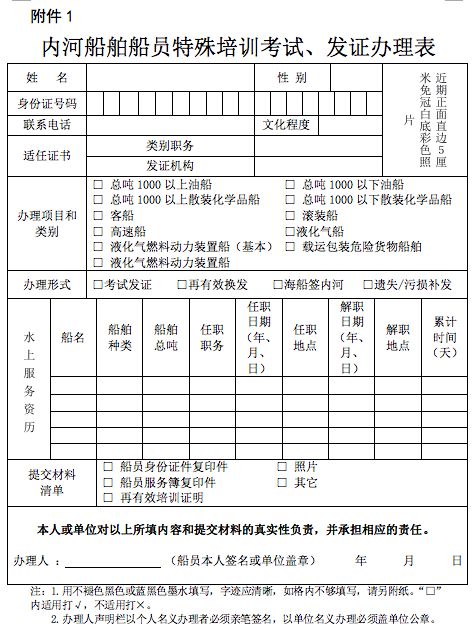 (一)《内河船舶船员特殊培训考试、发证办理表》(格式见附件1);