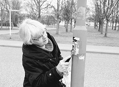 “这是我出门时常带的工具。”门萨—施拉姆说到这里,给我讲了一次去拜访姐姐的经历。“我姐姐住在卡尔斯鲁厄附近。有一次我在她家,想拎着袋子出去看看有没有新纳粹的宣传标语,姐姐立即生气地说‘我们这里没有这些东西’,我说,那就让我去看看吧。”结果,门萨—施拉姆在她姐姐家附近进入主路的路牌上,就找到了一个新纳粹组织的标语。从那以后,姐姐受她的影响,在看见纳粹标语时,也随手把它取下来。说到这里,一种自豪感洋溢在门萨—施拉姆脸上。