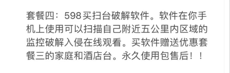此外,读特新闻记者还发现,在淘宝等平台,还有商家售卖破解周围摄像头的服务。该商家介绍称,通过其提供的软件,可扫描自身周围五公里内区域的监控并破解,达到在线观看的目的。
