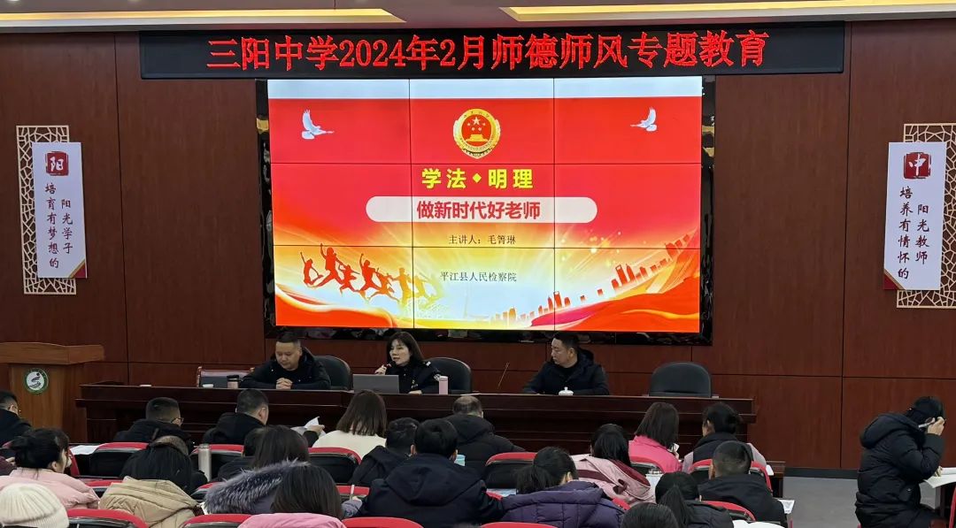 2月23日,平江县人民检察院干警毛箐琳受邀为三阳中学300余名教师讲授开学季专属法治教育课。