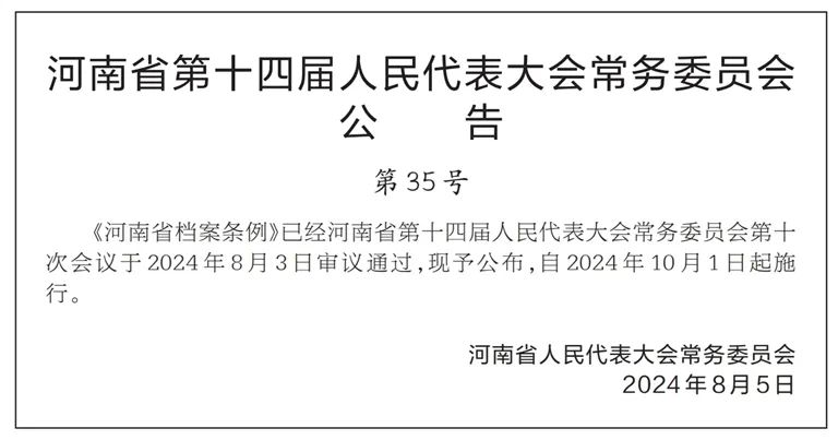 档案工作存史资政育人。为加强档案管理,规范档案收集、整理工作,新修订的《河南省档案条例》经省十四届人大常委会第十次会议表决通过,今年10月1日起施行。