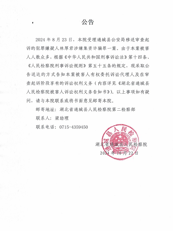 2024年8月23日,本院受理通城县公安局移送审查起诉的犯罪嫌疑人林厚君涉嫌集资诈骗罪一案。由于本案被害人人数众多,根据《中华人民共和国刑事诉讼法》第十四条、《人民检察院刑事诉讼规则》第五十五条的规定,现采取公告送达的方式告知本案被害人有权委托诉讼代理人及在审查起诉阶段享有的诉讼权利义务(内容详见《湖北省通城县人民检察院被害人诉讼权利义务告知书》)。以上事项如有疑问,请与本院联系或将书面意见邮寄本院。