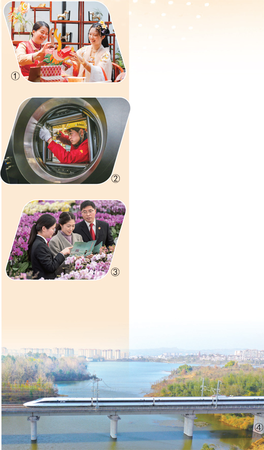 图④:重庆市梁平区双桂湖国家湿地公园,高铁列车与湿地公园构成一幅美丽画卷。