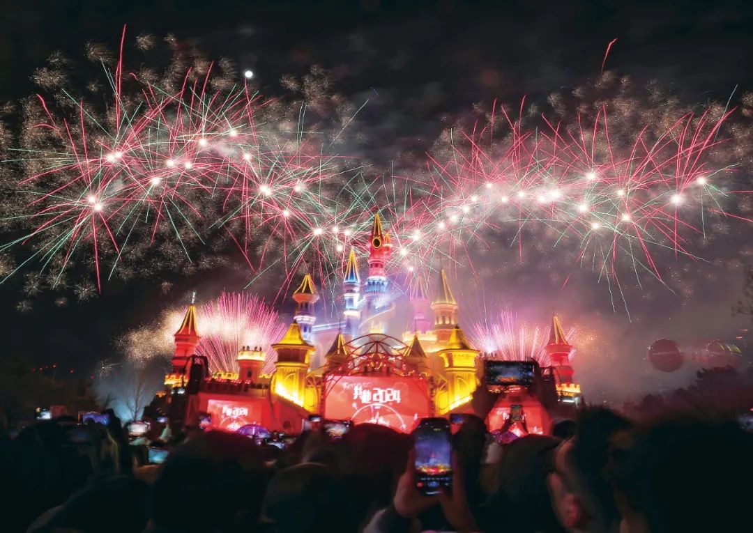 >>1月1日,游客在沈阳方特欢乐世界观看烟花表演。 新华社记者 龙雷/摄