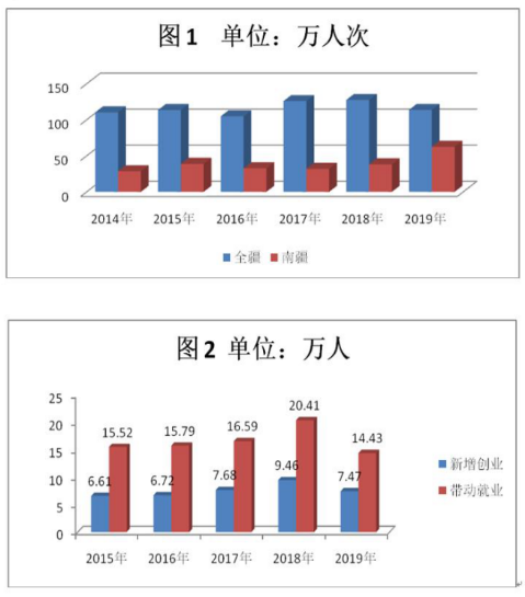 加强就业技能培训。每年,政府在这一领域投入大量资金。阿克苏地区按照个人自愿和市场需求确定培训职业(工种)和人数,重点开展农村富余劳动力外出就业技能培训、纺织服装企业新招录员工岗前培训等,有效提升了当地劳动力就业能力。据统计,2014年至2019年,新疆安排各类技能培训多达695.7万人次,其中南疆四地州232.5万人次(如图1),新增创业37.94万人,带动就业82.74万人,年均创业7.59万人(如图2)。