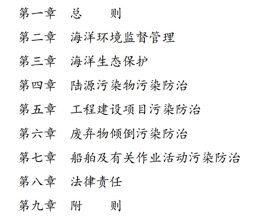 修订后的《海洋环境保护法》由原来的十章共97条,修改为九章共124条,增加了27个条款。其中,新《海洋环境保护法》中第五章“工程建设项目污染防治”合并了旧法中的“防治海岸工程建设项目对海洋环境的污染损害”和“防治海洋工程建设项目对海洋环境的污染损害”两章。