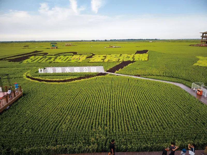 站在盘锦市红海滩水稻公园的瞭望塔上,记者看到一片片的稻田被分隔成艺术的图案,小火车穿行其间,游客不时地拍照打卡。