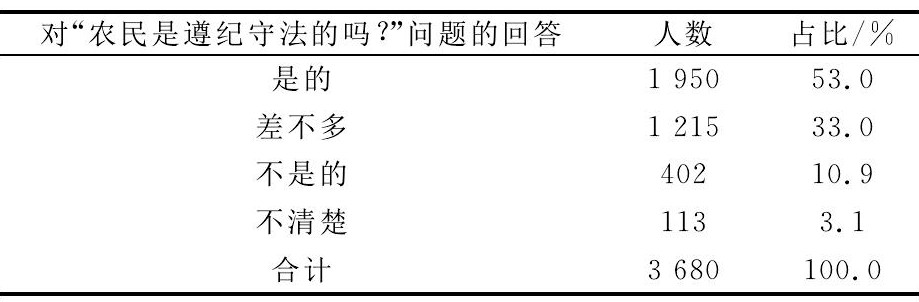 然而,从调研情况来看,绝大多数农民都认为,他们基本上能够做到遵纪守法。在调查的3680位农民中,53.0%的农民明确表示,现阶段农民群众一般都是遵纪守法的;33.0%的农民表示,虽然他们自己不是很确定所有人能够遵守法律,但是,农民差不多都是比较规矩的;只有10.9%的农民认为农民不遵纪守法。可见,绝大部分农民都有一定的法律意识,且大都表示农民是遵纪守法的(见表5)。