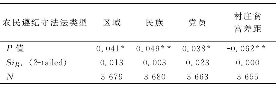 问题是,农民遵纪守法是否存在着一定的类型化特征?以个体特征、家庭和村庄特征作为自变量,经过CHI-SQUARE检验,分析结果见表6。