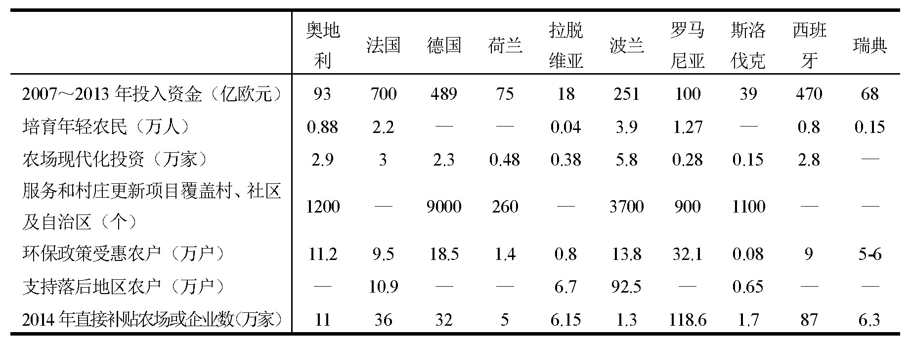 欧盟以共同农业政策为主体的农业农村政策发挥了重要作用。根据2017年12月欧洲民意调查(Eurobarometer)对欧盟所有成员国2.8万公民开展的关于共同农业政策认知情况的调查,超过60%的受访者认为,共同农业政策使全体公民受益;超过75%的受访者认为,共同农业政策发挥了保障食物有效供应的作用;64%的受访者认为,共同农业政策在保障供应健康、安全的高质量食物方面发挥了重要作用;62%的受访者认为,共同农业政策帮助实现了可持续的食物生产方式[16]。共同农业政策已成为欧盟各成员国农业农村发展、生态环境建设、乡村居民就业增收的重要保障(详见表3),也是培育农业农村发展动能的重要推动力量。比如,2007~2013年,欧盟在共同农业政策下支出了75亿欧元用于英国农村发展项目,培训了50万名农村和涉农食品行业就业者,推动了5万家小微企业创业,帮助了4万多家农场提高竞争力[17]。农村发展政策被认为是欧盟最受欢迎的政策之一[18]。这主要得益于欧盟及成员国采取了合理的政策制定理念、执行策略和管理方式。