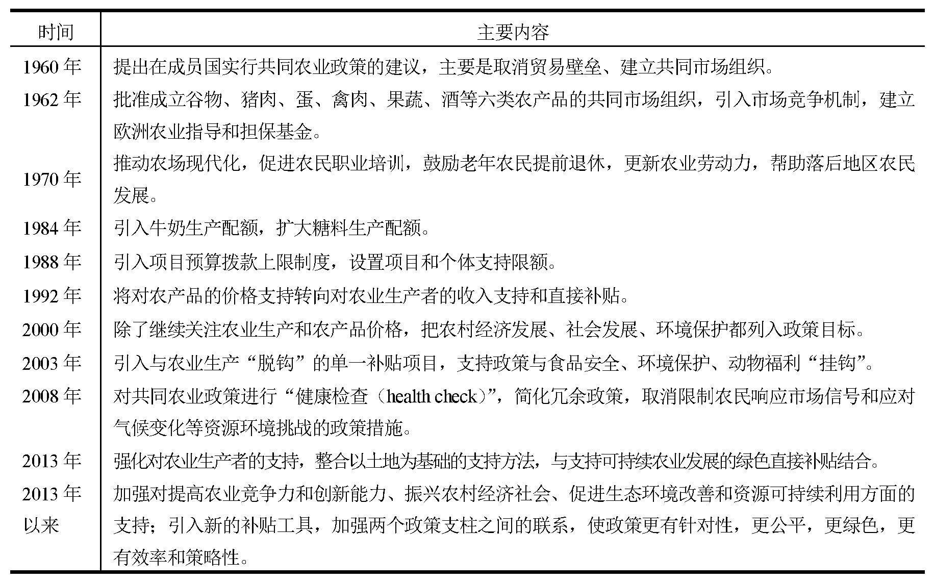 可见,欧盟共同农业政策随着关注领域的拓展和农业农村发展主要矛盾的变化,由单一农业政策逐步拓展成广泛关注农村经济、社会、环境议题,以提高农业竞争力、保障食品安全、确保农民生活达到合理水平、应对气候变化、实现自然资源的可持续利用、激发农村经济活力、促进农业和相关产业领域就业为主要内容的全面发展政策。这一演变过程可由表1、表2呈现。