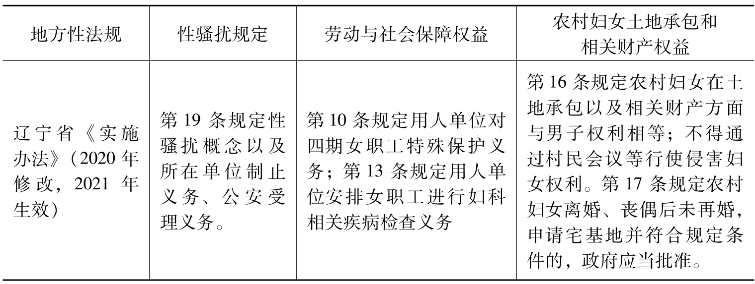 我国现有关于妇女权利保障的行政法规有《特别规定》等,相较《妇女法》等基本法,这些法规规章条款更为具体细致,司法适用性更强。同时,我国地方文化经济等差异决定了统一立法难以完全照顾到不同的地方具体情况,地方可根据上位法结合本地情况制定实施办法。地方立法一方面需要符合上位法的基本精神,在不与《妇女法》等上位法或行政法规相抵触的前提下,将国家有关制度和规定细化为更加符合地方实际,更具有针对性、可操作性、可执行性的条文。另一方面,各地实施办法修订工作应积极吸纳理论界最新研究和实务界最新探索,在立法模式、章节架构、制度创新方面可以作出比统一法更为大胆的尝试。但是,囿于上位法的滞后和辖制,下位规章和办法尝试创新和突破时又容易陷入整体优化乏力的困境,一定程度上对《妇女法》修订完善工作形成倒逼态势。地方创新性立法是满足地方发展需求,实现地方治理法治化的必由之路。地方为中央立法发挥先行先试、立法“试验田”的作用,为正式立法积累了经验、创造了条件,有助于完善社会主义法治体系。《立法法》为地方立法先行先试提供了法律依据。如下表所示,近年一些地方实施办法已经先行进行了修订,新增和更新内容主要集中在性骚扰防治、劳动与社会保障权益、农村妇女土地承包、其他财产权益等纠纷矛盾较多的四个方面。