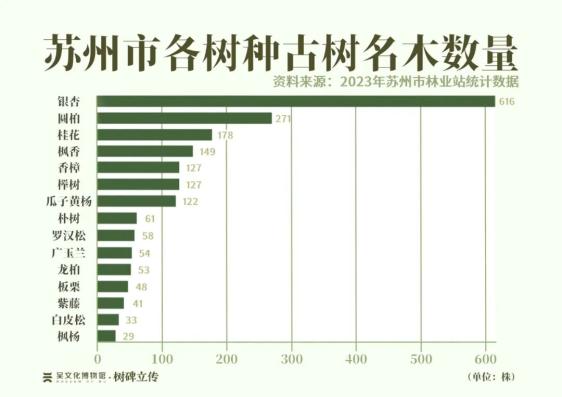 一方水土养一方树木。山温水软、四季分明的苏州,孕育了丰富的植物资源。全市古树名木共涉及43个科、76个属、93个树种,其中大多是苏州的乡土树种,最多的是银杏,多达616株,其后依次是圆柏、桂花、枫香、香樟、榉树、瓜子黄杨等。另外也有广玉兰、白皮松、石榴等外来树种,千百年来,文人墨客们来来往往,离苏做官,或是来苏任职,将奇花异木送出去、引进来。