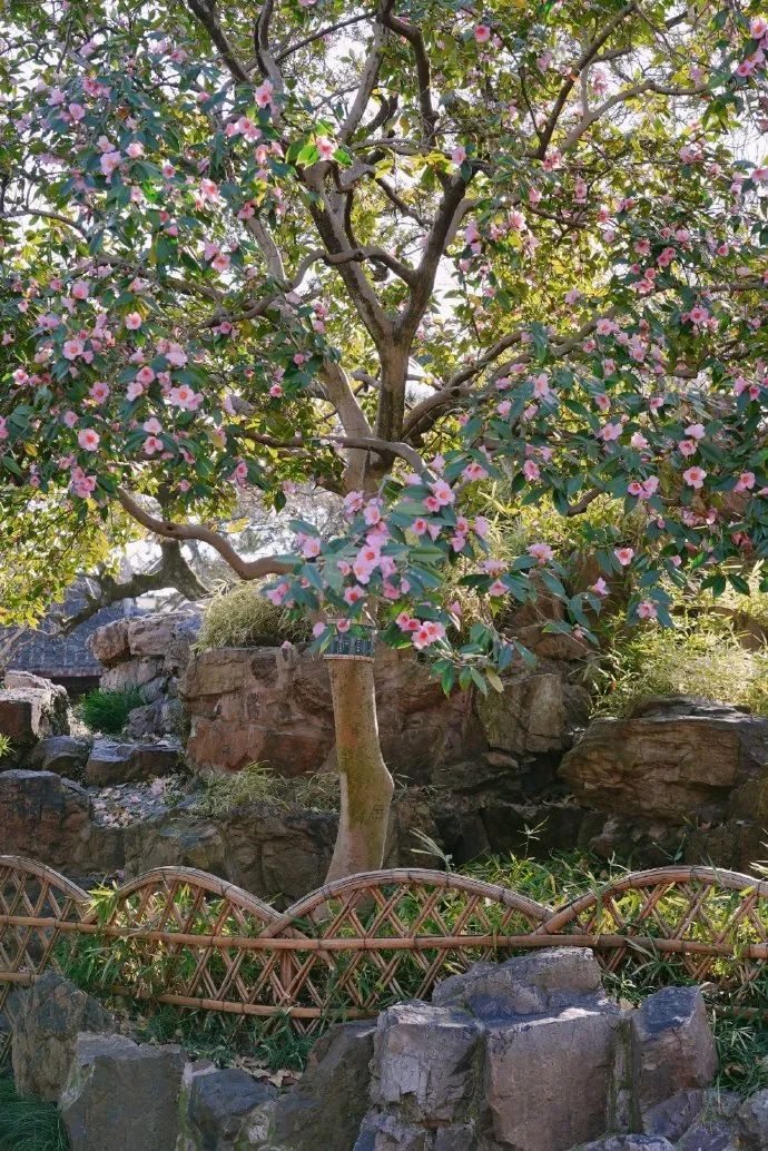 草木凋零时,去耦园看美人茶。东花园城曲草堂前的黄石假山上,两棵山茶雍容舒展,粉色花瓣缀满枝头,格外明媚。这两棵山茶为“美人茶”,是茶梅的一个园艺栽培品种,其中一棵是百年古树,从年份来看,她或许就是在清代文人沈秉成与他的妻子严永华住在园中时栽下,见证了他们诗酒唱和的爱情。87版《红楼梦》电视剧中,这株美人茶还在黛玉葬花的画面中出镜。