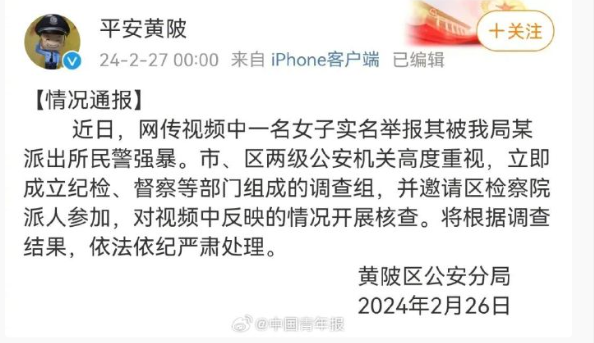 9.湖北一民警被实名举报强暴未成年女孩?当地成立调查组:26日,一女子在网上发视频实名举报称,自己2023年9月在湖北武汉黄陂区盘龙城经济开发区派出所遭到民警吴某强暴,当时她未满18岁。27日,武汉市公安局黄陂区分局通报称,市、区两级公安机关对此高度重视,立即成立纪检、督察等部门组成的调查组,并邀请区检察院派人参加,对视频中反映的情况开展核查。将根据调查结果,依法依纪严肃处理。(中国青年报)