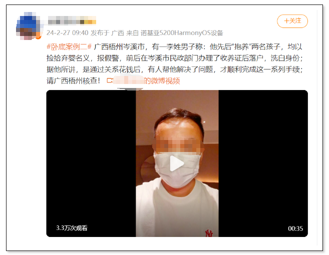 8.男子以捡拾弃婴为名报假警“抱养”两名孩子,官方通报:27日,有网友爆料称,广西壮族自治区岑溪市一李姓男子先后以捡拾弃婴名义,报假警“抱养”两名孩子,在岑溪市民政部门办理收养证后落户,并通过关系花钱解决了收养手续问题。对此,岑溪市政府通报称,了解相关线索后,迅速成立由公安、民政、卫健等部门组成的工作专班,目前正在积极推进相关线索的调查取证工作。(法治日报)