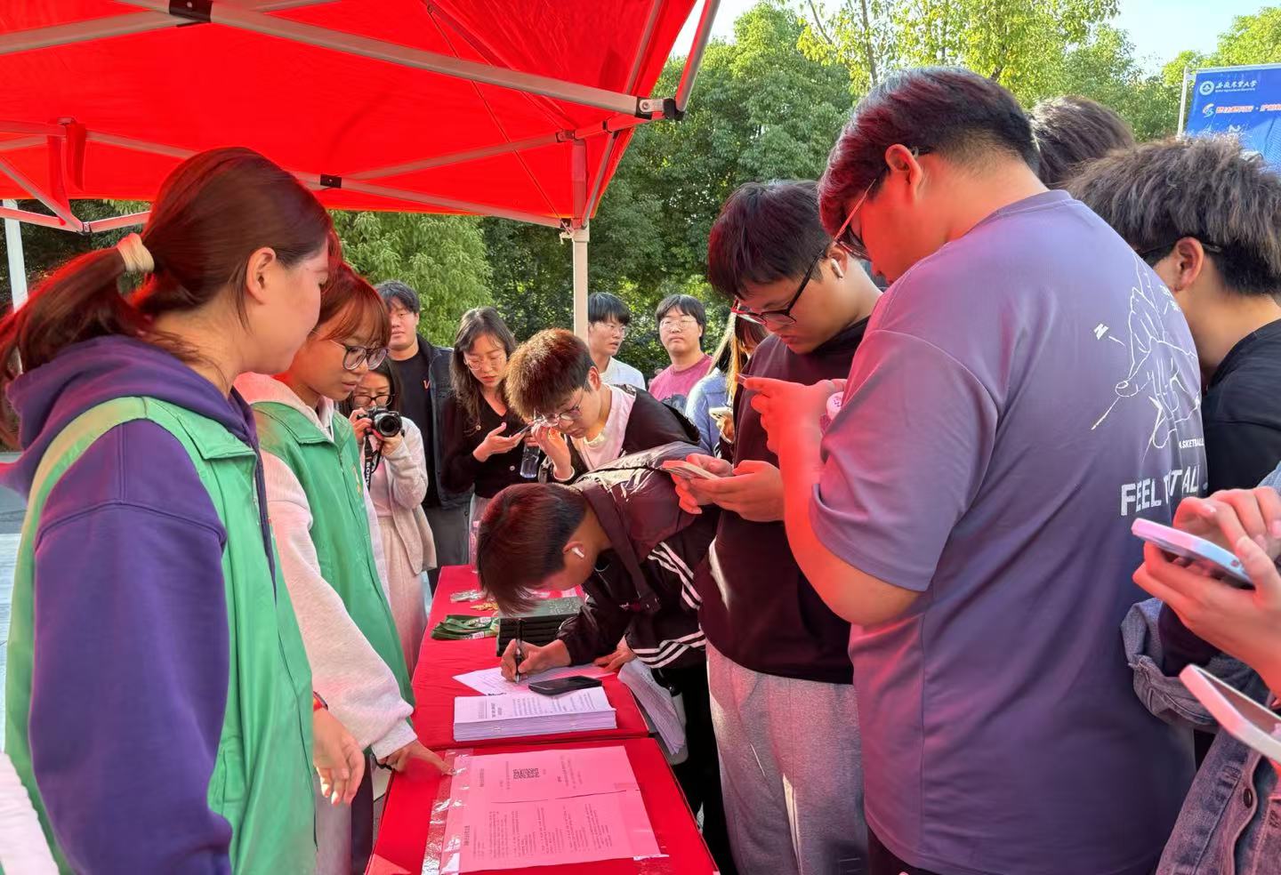 当天下午,该校图书馆报告厅内,一场关于网络安全法律法规要点解读的网络普法专题讲座引人入胜。报告厅外,两列活动展板生动展示了中国网络法治三十年的实践成就,以及安徽农业大学近年来在网络普法上的一系列鲜活实践和特色做法,吸引了不少师生驻足观看。展板一旁的“网络普法有奖答题”活动也是人气满满,同学们积极扫码回答问题,现场氛围浓厚。