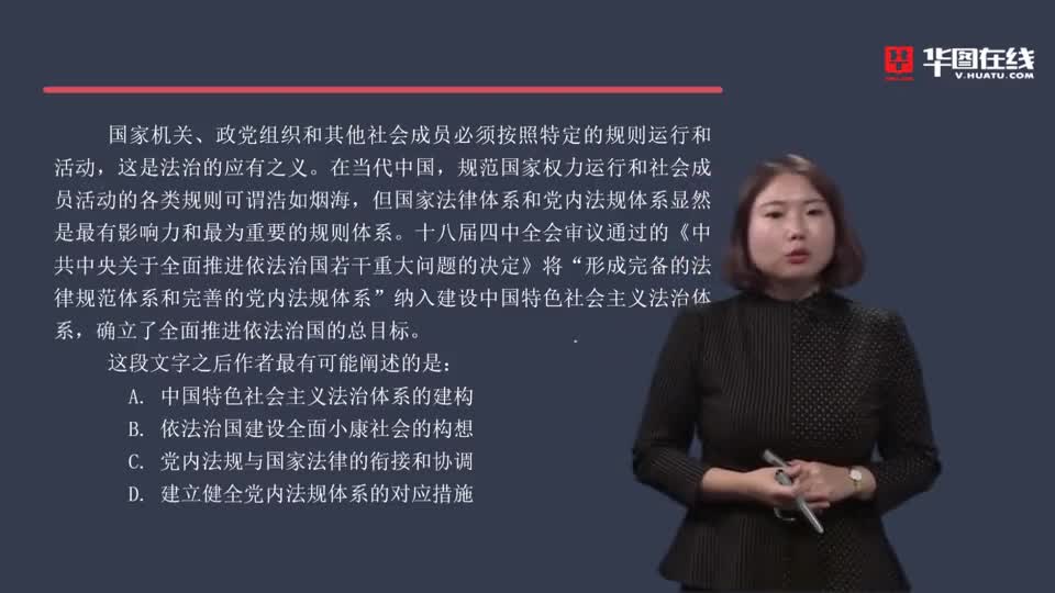 要点:第一步,快速浏览文段,重点分析尾句,判别文段话题落脚点。文段首句引出话题,说明法制规范国家权力运行和社会成员活动的意义。第二句通过转折词“但”提出重点,即国家法律体系和党内法规体系是各类规则中最有影响力和最为重要的。第三句援引十八届四中全会通过的文件内容,进一步强调了“完备的法律规范体系和完善的党内法规体系”的重要性。文段话题落在国家法律与党内法规两个方面。接下来应围绕“国家法律与党内法规”这一话题进行论述。第二步,对比选项。C项提到了党内法规和国家法律的关系,话题衔接一致。A项属于前文已经论述的内容,下文不会再论述,排除A项。B项“建设全面小康社会”属于无中生有,前文没有提及,排除B项。D项只提到党内法规一方面,表述片面,排除D项。因此,选择C选项。