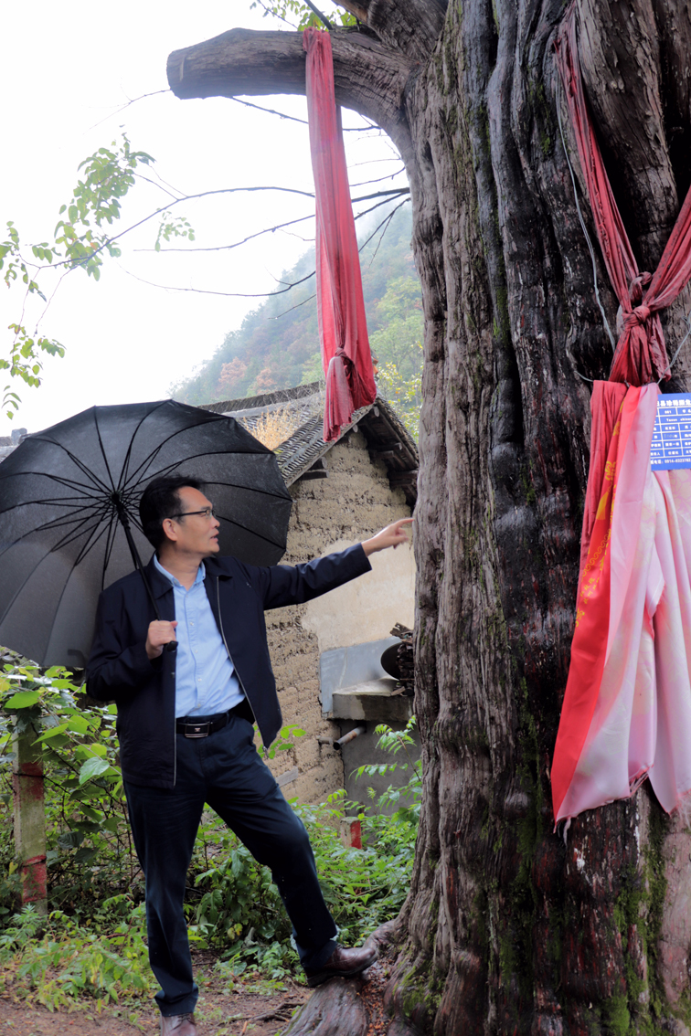 在山阳县城关镇街办三合村和十里街办王坪村,党双忍带领大家实地查看“陕西红豆杉王”和“山阳二号秦岭红豆杉”。这两株红豆杉均有千年以上历史,其中“陕西红豆杉王”树干粗壮,3个成年人才能勉强合抱。山阳二号红豆杉被当地村民称为“神树”,树冠如伞,灿若繁星的红色果实煞是惹人喜爱,树根旁边还有村民搭建的祭台。